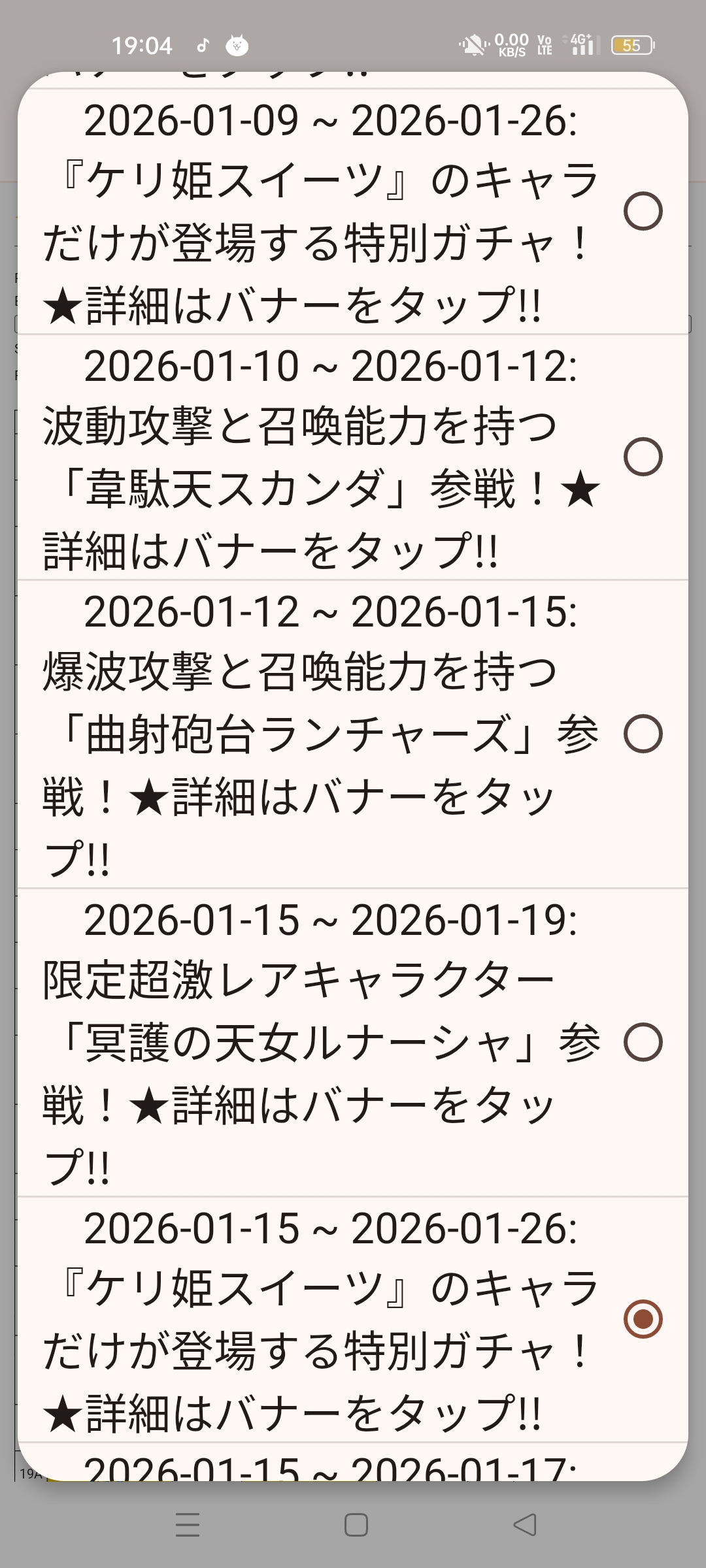 テーブルはプラチケやレジェチケ含む全てのレアガチャが連動して進むので、Event欄から各イベントの内容を比べて、より良いキャラを引けるガチャを探してみましょう。